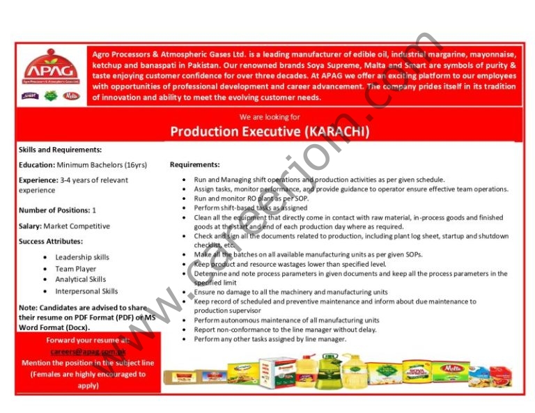 Agro Processor Atmospheric Gases Ltd APAG Jobs Production Executive