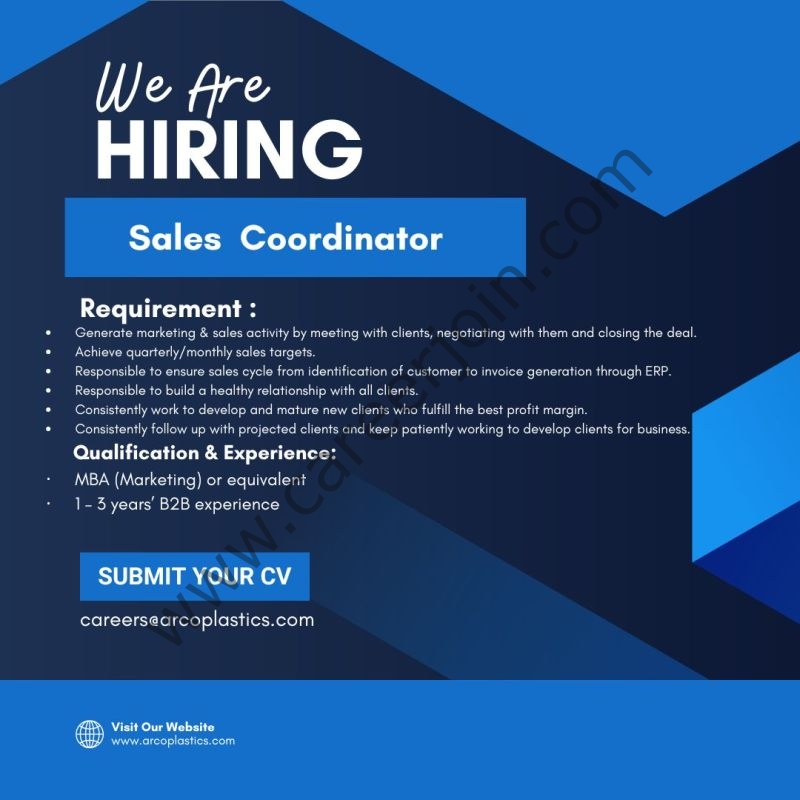 Arco Plastics is looking for Sales Coordinator – Lahore.