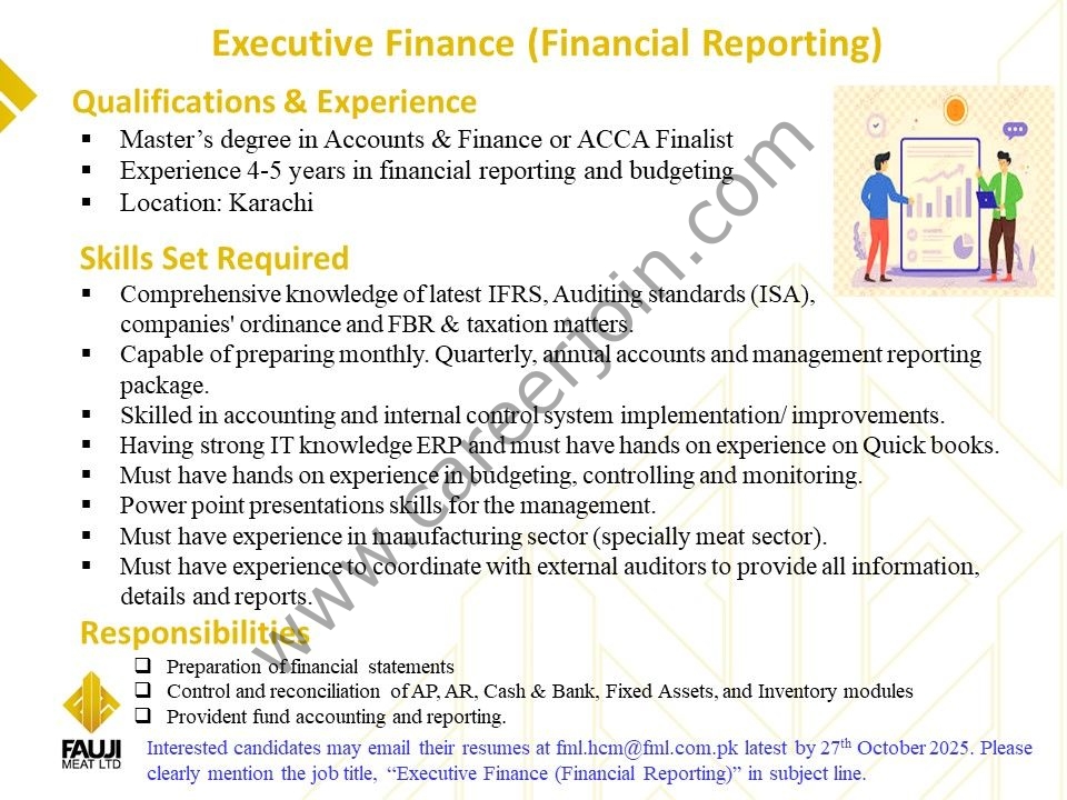 Interested candidates may email their resumes at fml.hcm@fml.com.pk latest by 27th October 2025. Please clearly mention the job title, “Executive Finance (Financial Reporting)” in subject line.