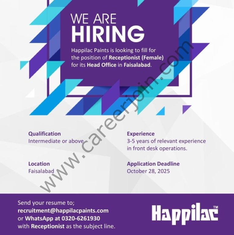Send your resume to recruitment@happilacpaints.com or WhatsApp at 0320-6261930 with Receptionist as the subject line.