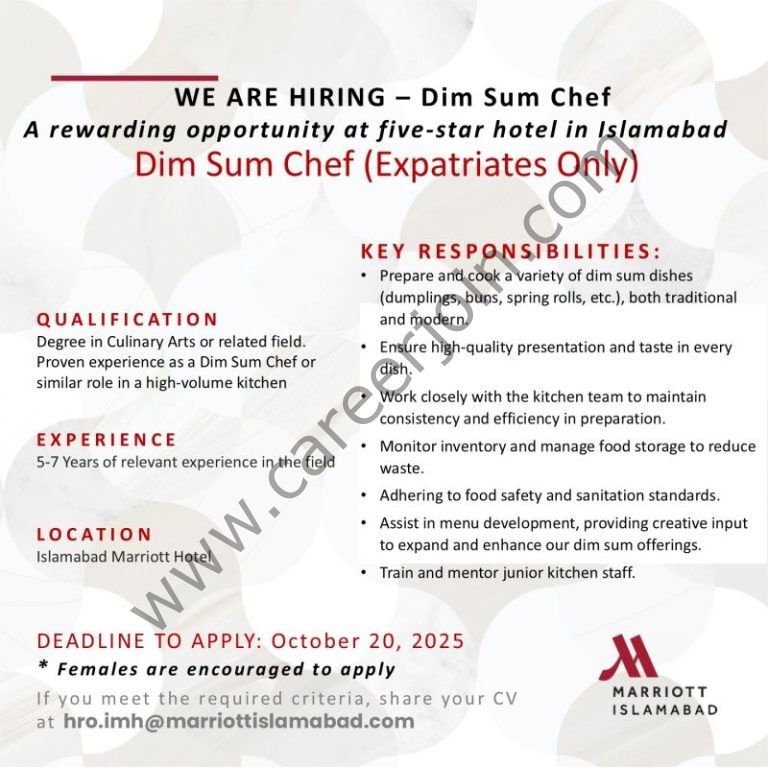 Islamabad Marriott Hotel Jobs Dim Sum Chef