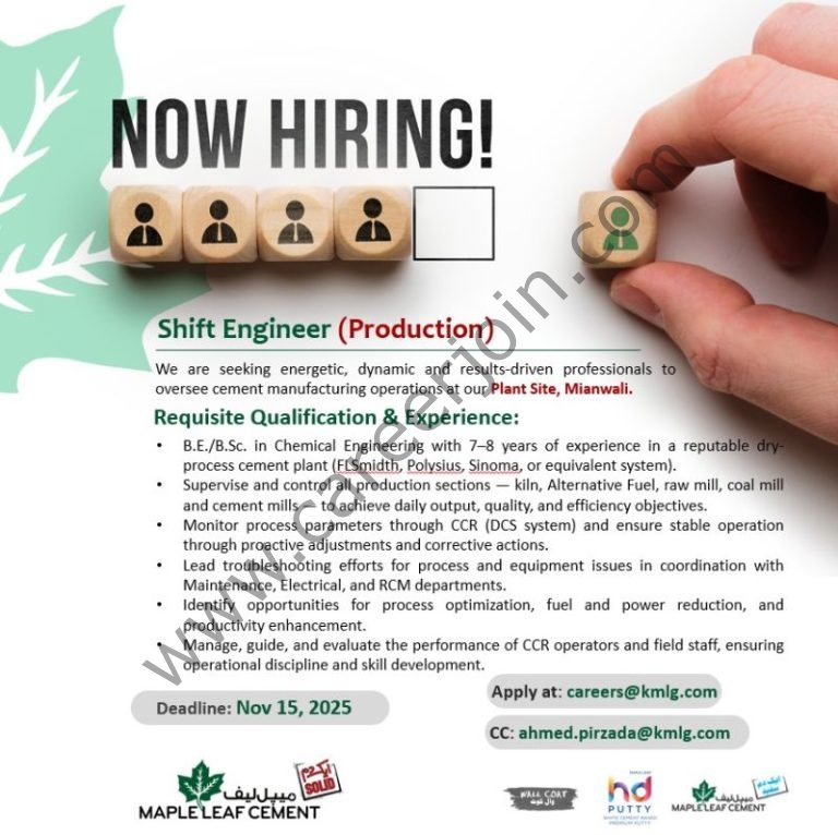 We are seeking energetic, dynamic and results-driven professionals to oversee cement manufacturing operations at our Plant Site, Mianwali.