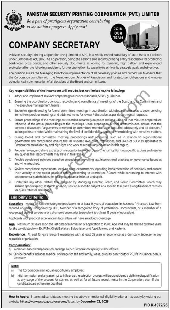 Pakistan Security Printing Corp Pvt Ltd Jobs Company Secretary