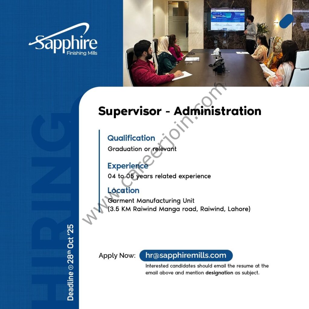 Sapphire Finishing Mills is looking for a 𝗦𝘂𝗽𝗲𝗿𝘃𝗶𝘀𝗼𝗿 – 𝗔𝗱𝗺𝗶𝗻𝗶𝘀𝘁𝗿𝗮𝘁𝗶𝗼𝗻 to join our Garment Manufacturing Unit in Raiwind, Lahore.