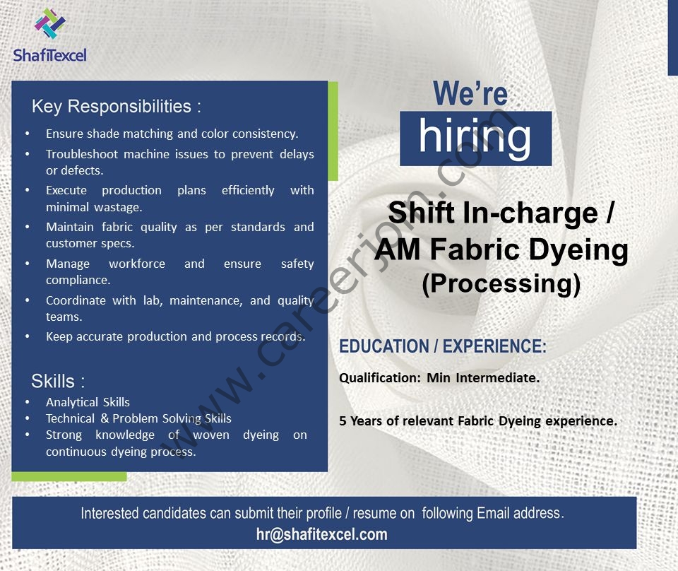 Shafi Texcel Pvt Ltd Jobs Shift Incharge / AM Fabric Dyeing (Processing)
