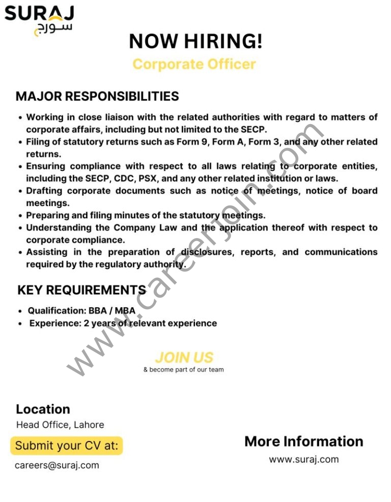 We are in search of an innovator who is prepared to enact meaningful change, if you’re the one, share your CV at careers@suraj.com and mention the Job Title: CORPORATE OFFICER