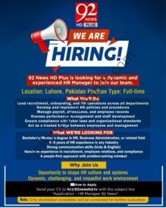 How to Apply Send your CV to hr@92newshd.tv with the subject line “Application – HR Manager 92 News”.