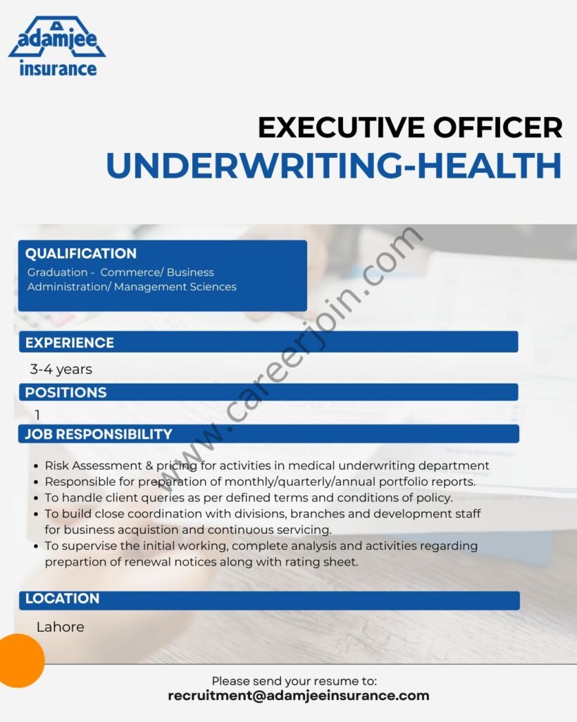Please send your resume to: recruitment@adamjeeinsurance.com
