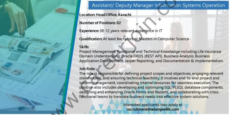 Adamjee Life Insurance Company Jobs Assistant/ Deputy Manager Information Systems Operation