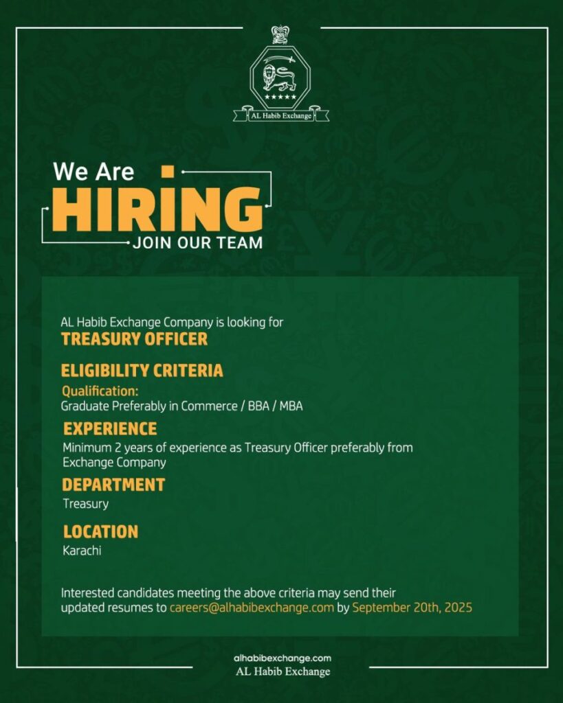 Interested candidates may apply online through careers@alhabibexchange.com by 20th September 2025