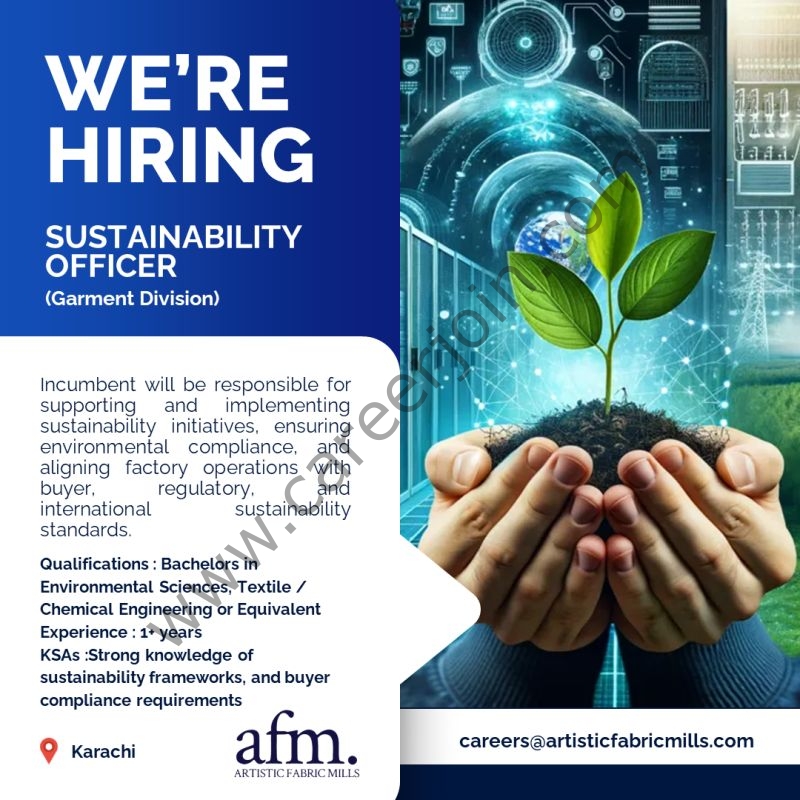 Artistic Fabric Mills in Karachi is in search of a committed Officer – Sustainability & Compliance (Garment Division) to become part of their team. This is a great chance for experts who are enthusiastic about the application of environment-friendly practices and compliance in the textile and garment sector.