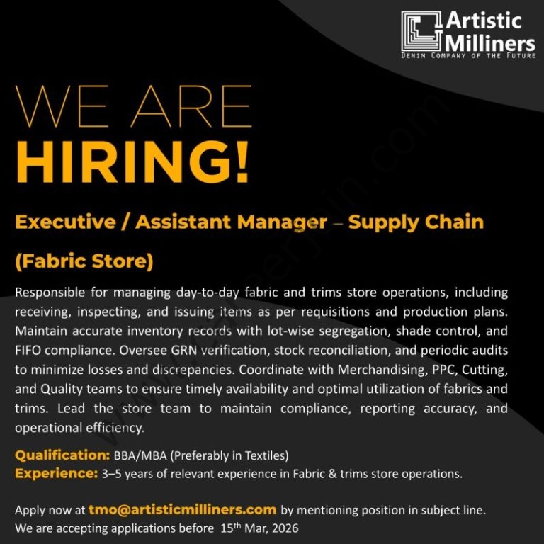 Artistic Milliners is hiring a professional to manage **Fabric and Trims Store** operations. Candidate must have good experience with **Inventory Control, FIFO Rules, Shed Management**, and close coordination with Merchandising, PPC, Cutting, and Quality Teams**.