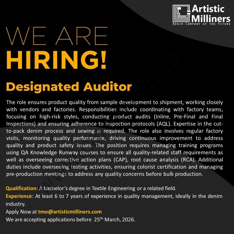 - Qualification: A bachelor’s degree in Textile Engineering or a related field.