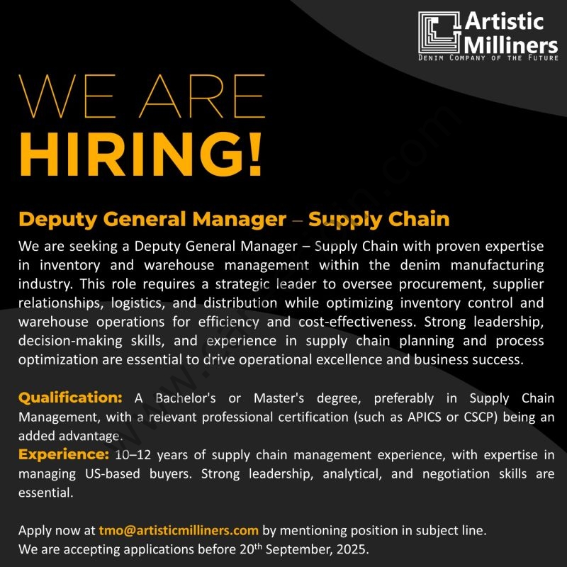 We are recruiting for the position of Deputy General Manager- Supply Chain with experience and success in inventory and warehouse management in a denim manufacturing environment. The Deputy General Manager will strategically lead procurement, supplier relationships, logistics and distribution, while maximizing efficiency and cost effectiveness in inventory and warehouse management. Successful candidates will possess strong leadership, decision-making capacity, supply chain planning, and process optimization skills to achieve operational excellence and business success.