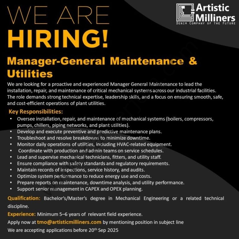Artistic Milliners Pvt Ltd Jobs Manager General Maintenance & Utilities