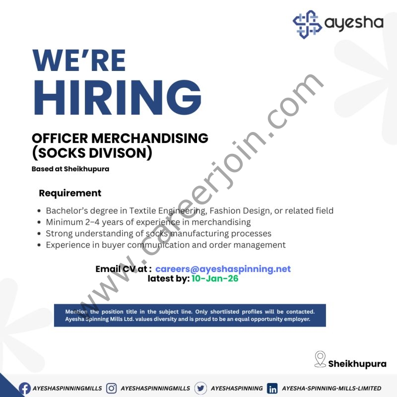 Ayesha Spinning Mills Limited Jobs – Officer Merchandising | January 2026 | Sheikhupura