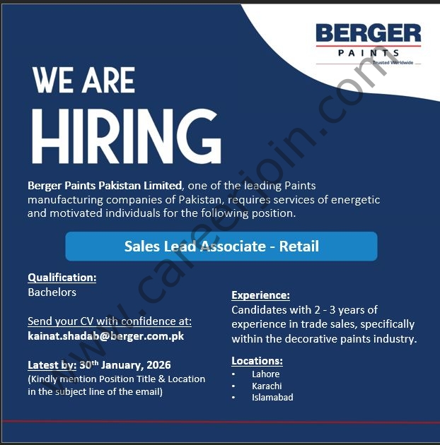 Berger Paints Pakistan is looking for potential candidates for the position of πππ₯ππ¬ ππππ ππ¬π¬π¨ππ’πππ for its sales departments in πππ«πππ‘π’, πππ‘π¨π«π & ππ¬π₯ππ¦ππππ .Candidates having relevant years of experience and qualification are encouraged to apply with position title in the subject line of given email: