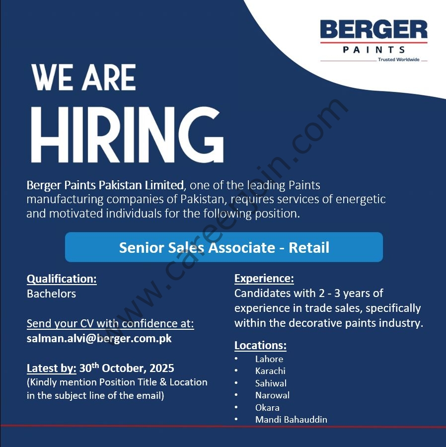 Berger Paints Pakistan is actively seeking talented professionals for the roles of Senior Sales Associate, Senior Relationship Officer, and Relationship Officer within our Retail Business Division.