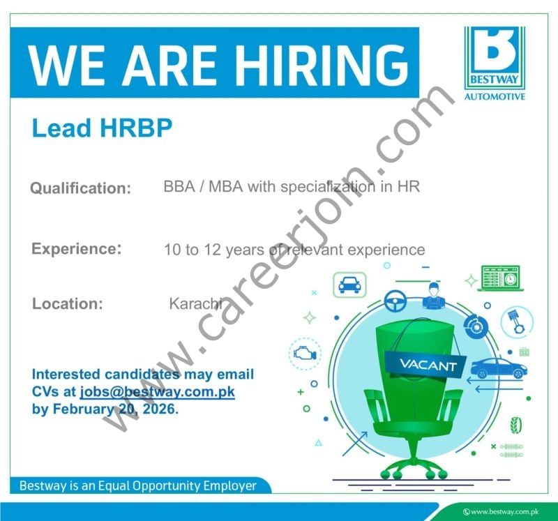 Interested candidates may email CVs at jobs@bestway.com.pk by February 20, 2026.