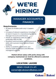 To careers@cakesandbakes.comwith the subject line “Manager Accounts & Finance”.
