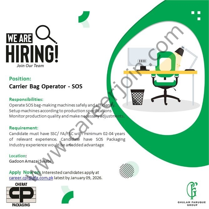 Cherat Packaging Pvt Ltd Jobs – Carrier Bag Operator (SOS) | January 2026 | Gadoon Amazai, Swabi