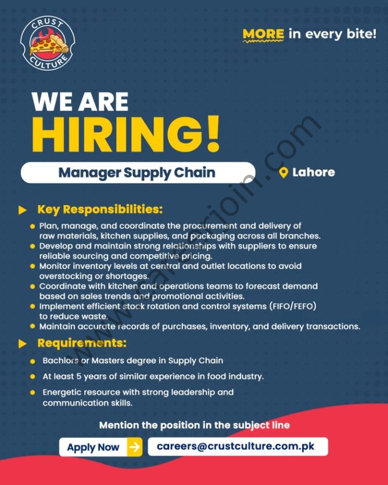 Mention the position in the subject line Apply Now: careers@crustculture.com.pk