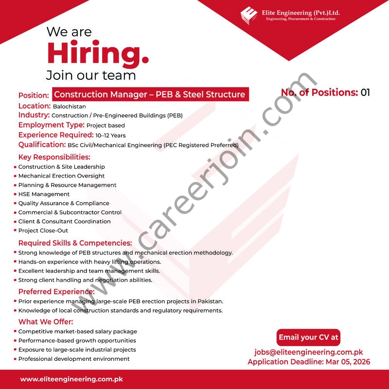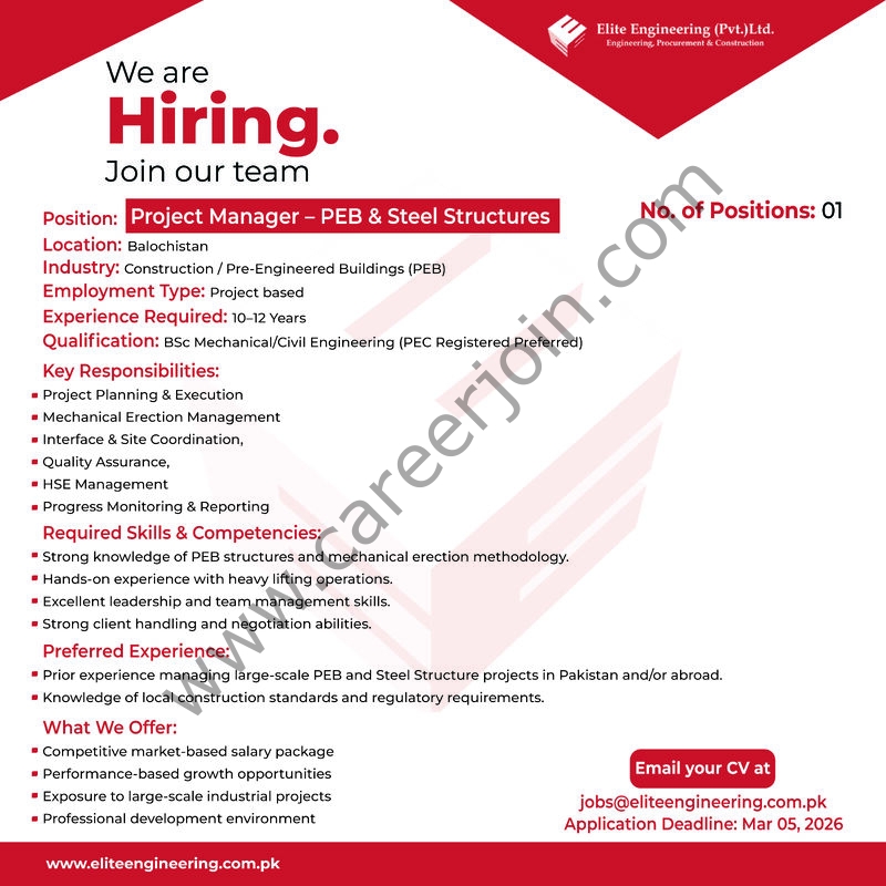 Interested candidates can share their CVs at jobs@eliteengineering.com.pk