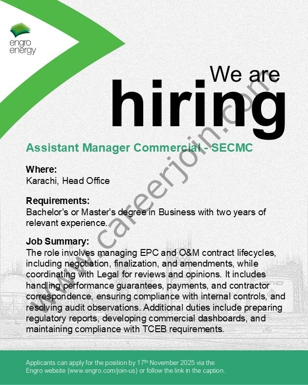 - Engro Energy is hiring an Assistant Manager Commercial – SECMC to support contract management and compliance operations at its Head Office in Karachi.