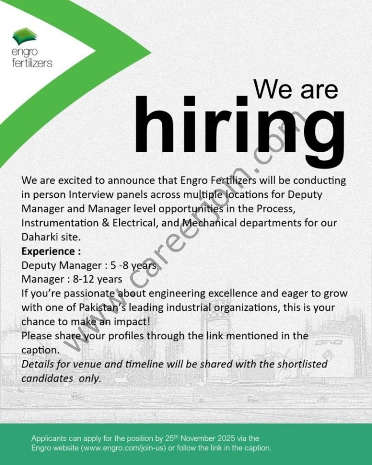 - Engro Fertilizers is conducting in-person interview panels across multiple locations for Deputy Manager and Manager positions in the Process, Instrumentation & Electrical, and Mechanical departments for our Daharki site.