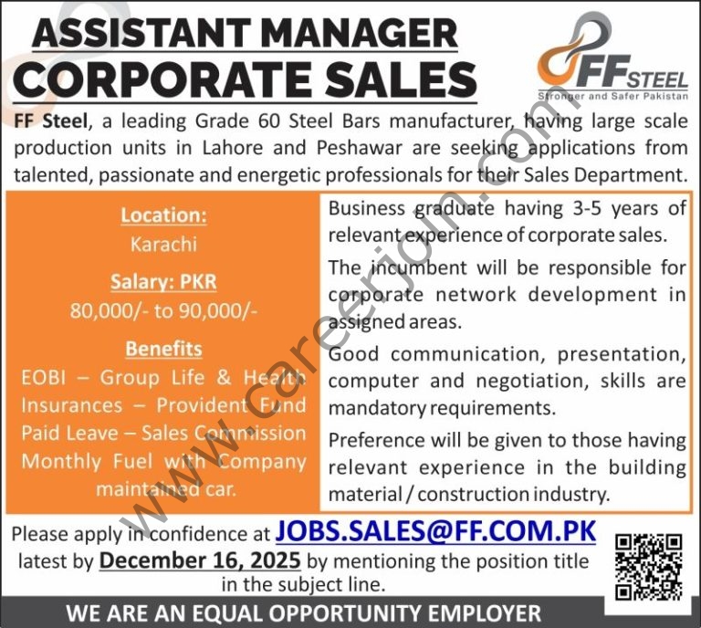 FF Steel, a leading Grade 60 Steel Bars manufacturer, having large scale production units in Lahore and Peshawar are seeking applications from talented, passionate and energetic professionals for their Sales Department.