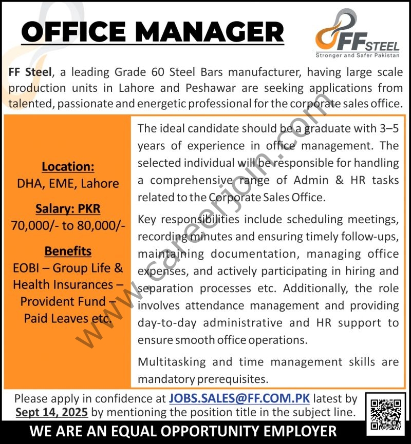 FF Steel, a leading Grade 60 Steel Bars manufacturer, having large scale production units in Lahore and Peshawar are seeking applications from talented, passionate and energetic professional for the corporate sales office.