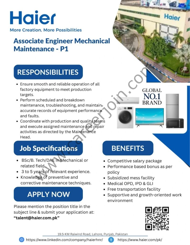Haier Pakistan Jobs Associate Engineer Mechanical Maintenance (P1)