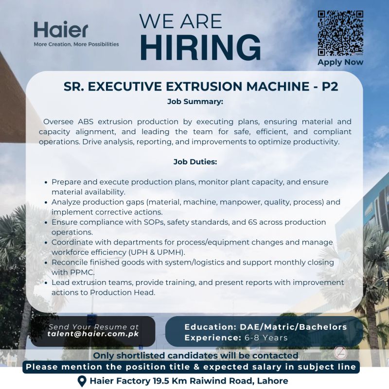 📢 Job Opportunity: Sr. Executive – Extrusion Machine (P2)
