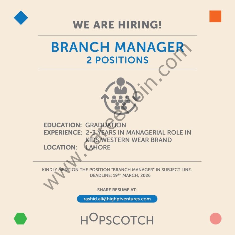 KINDLY MENTION THE POSITION “BRANCH MANAGER” IN SUBJECT LINE. DEADLINE: 19TH MARCH, 2026