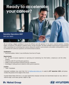 Email their CVs to hr@hyundai-nishat.com to apply by 06th September 2025, and please mention the position in the subject of the email.