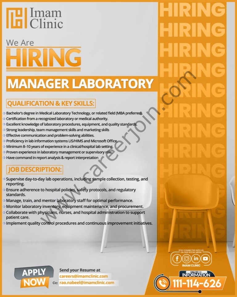 Are you a Lab Expert with a vision for perfection? 🔬 Imam Clinic is hiring a Manager Laboratory to oversee our diagnostic operations and ensure the highest accuracy for our patients. If you have 8-10 years of clinical lab experience and strong leadership skills, apply today to join our growing healthcare family!