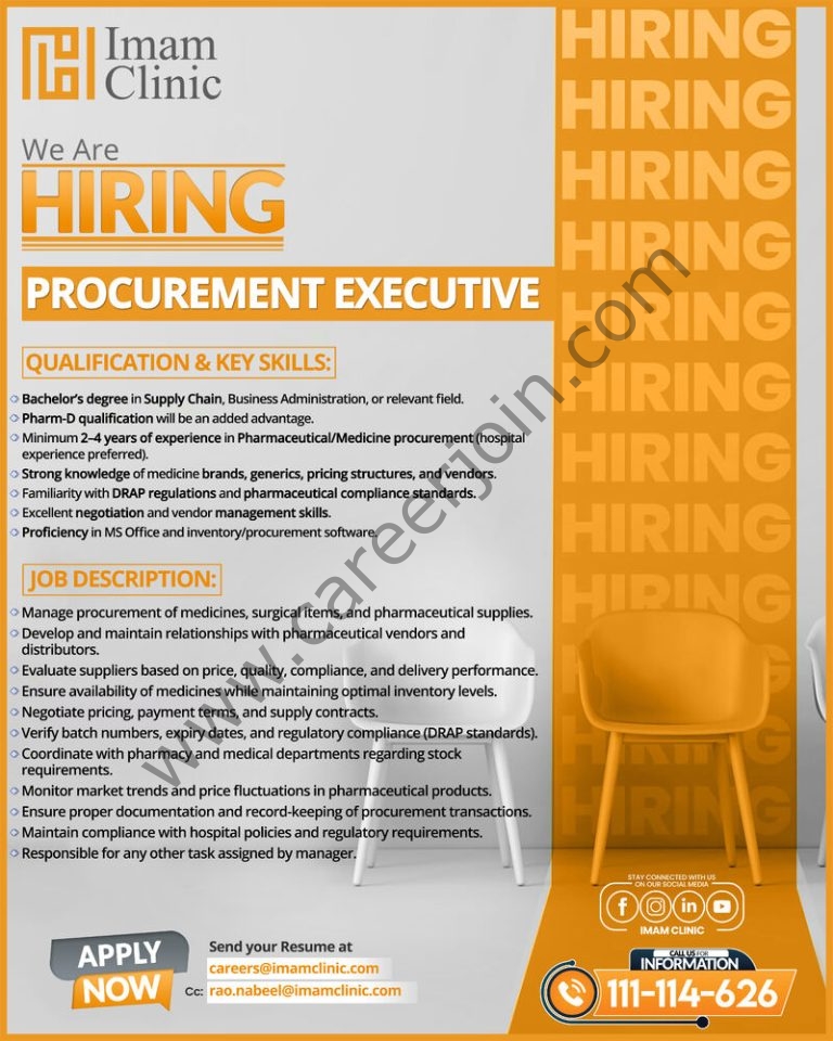 Master the art of the supply chain in the healthcare sector! Imam Clinic is looking for a sharp Procurement Executive to manage our pharmaceutical and surgical supplies. If you have a background in Supply Chain or Business Admin and know how to negotiate for quality, we want your expertise on our team!