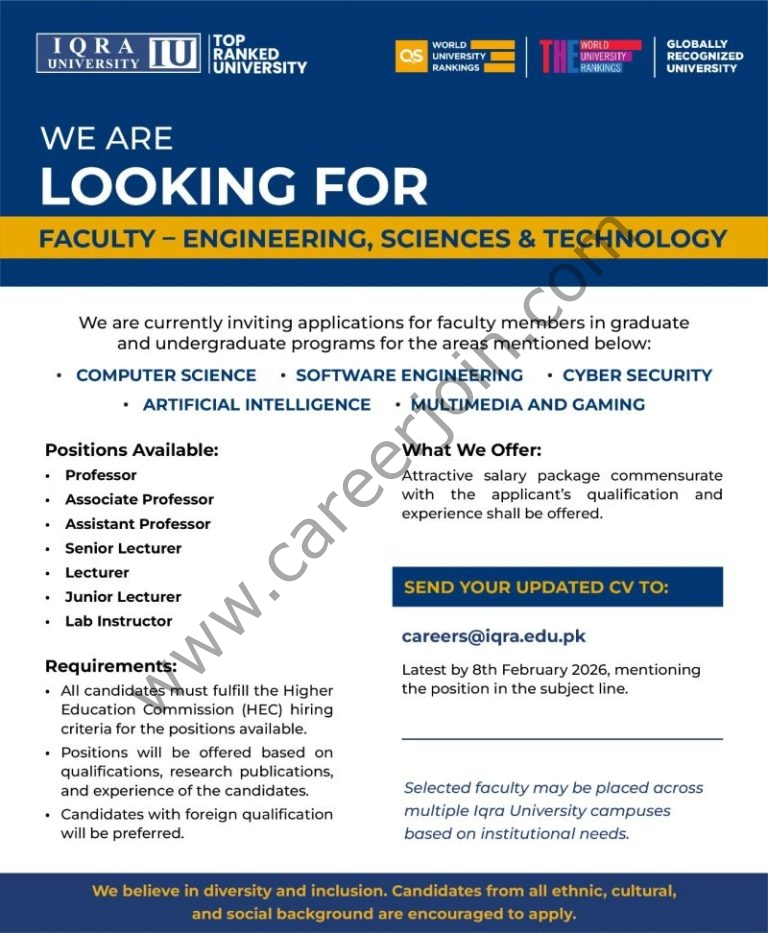 Iqra University is inviting applications for faculty positions in the Faculty of Engineering, Sciences & Technology for undergraduate and graduate programs.