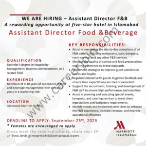 🕒 Don’t miss this chance to join our dynamic team! Apply now and take the next step in your career with Islamabad Marriott Hotel.