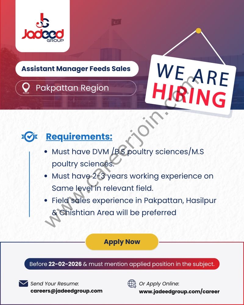 Jadeed Group is looking for an Assistant Manager Feeds Sales to strengthen our presence in the Pakpattan Region. If you have a background in Poultry Sciences (DVM / B.S / M.S) with 2β3 years of relevant field sales experience, and knowledge of local markets including Hasilpur and Chishtian, we invite you to grow with an industry leader.
