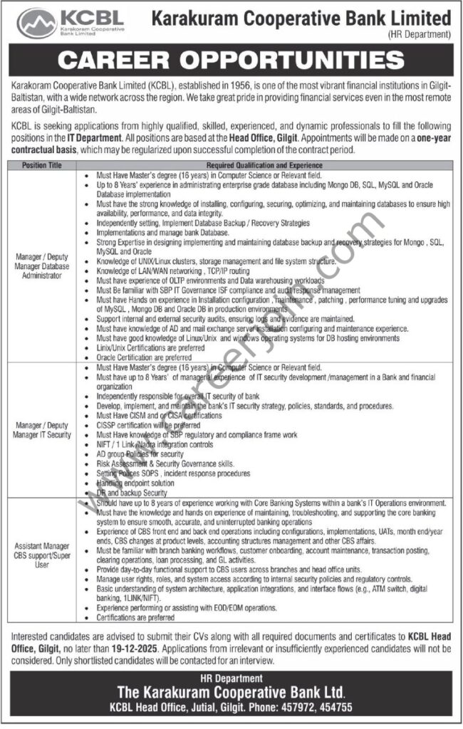 Karakoram Cooperative Bank Ltd KCBL Jobs December 2025