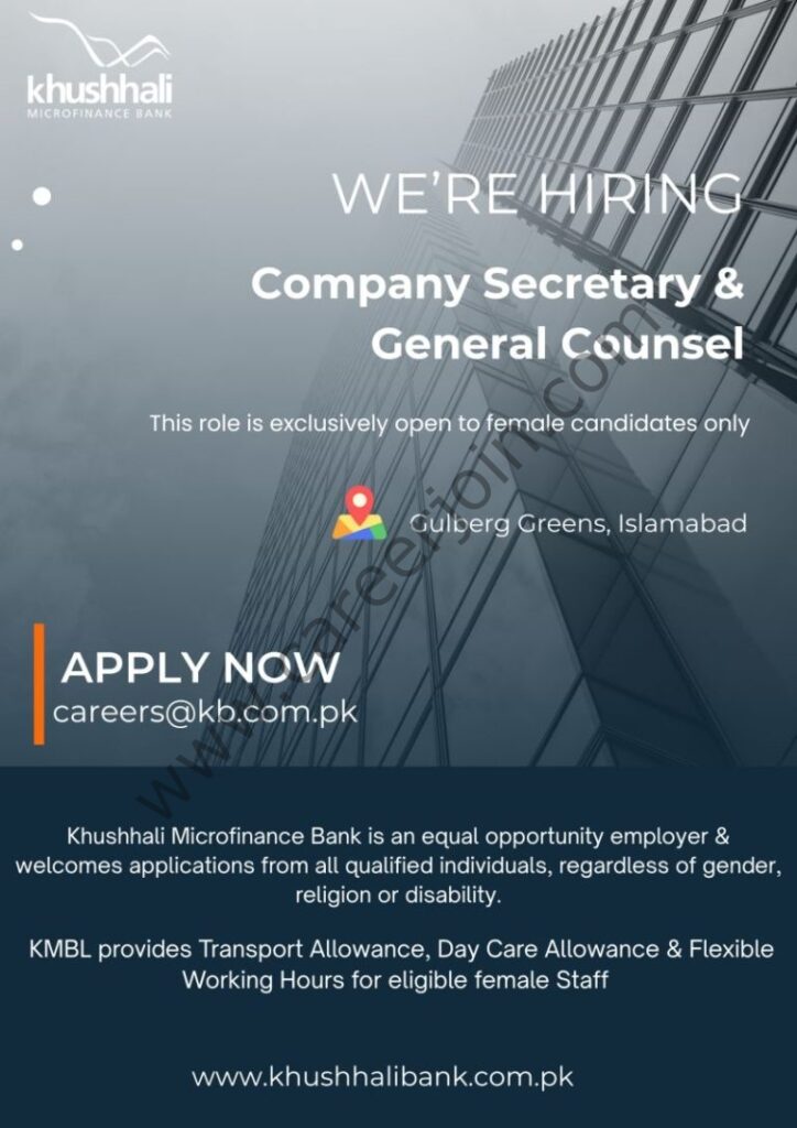 Khushhali Microfinance Bank Limited is looking for Company Secretary and General Counsel