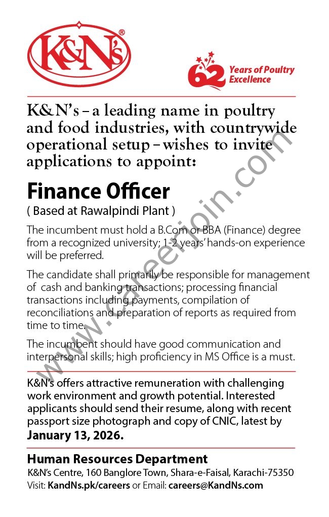 K&N’s Pakistan is hiring a Finance Officer at its Rawalpindi Plant to manage financial operations, ensure compliance, and support financial reporting and analysis for effective decision-making.