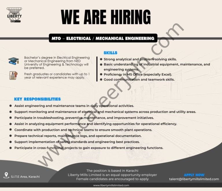 - Employer Note: Liberty Mills Limited is an equal opportunity employer. Female candidates are encouraged to apply.