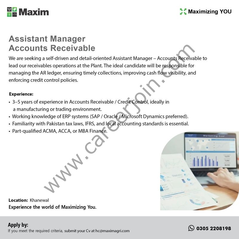Maxim Agri is looking for candidates for the position of Assistant Manager Accounts Receivable.