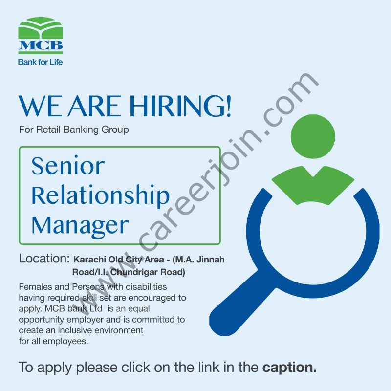 Are you looking for a career in one of Pakistan’s leading Banks? The Retail Banking Group of MCB Bank is looking for Sr. Relationship Manager to join its team of talented, motivated and highly skilled professionals.