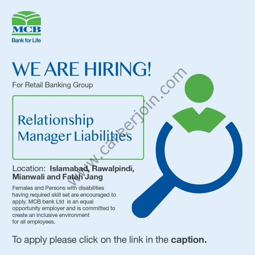 Are you looking for a career in one of Pakistan’s leading Banks? The Retail Banking Group of MCB Bank is looking for a Relationship Manager Liabilities to join its team of talented, motivated, and highly skilled professionals.