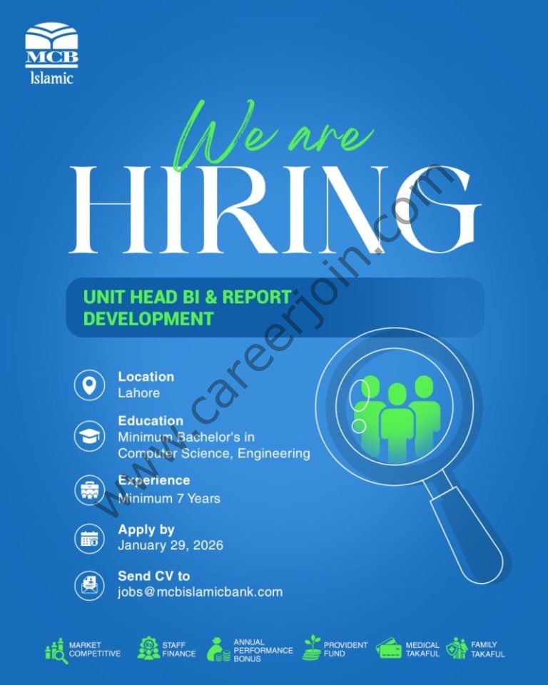 MCB Islamic Bank is inviting applications for the position of βUnit Head BI & Report Developmentβ. Join our growing team to drive business growth and deliver exceptional customer satisfaction.