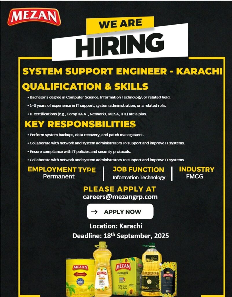 The Mezan Group is seeking a System Support Engineer to enhance its IT infrastructure and ensure seamless day-to-day system operations throughout the organization.