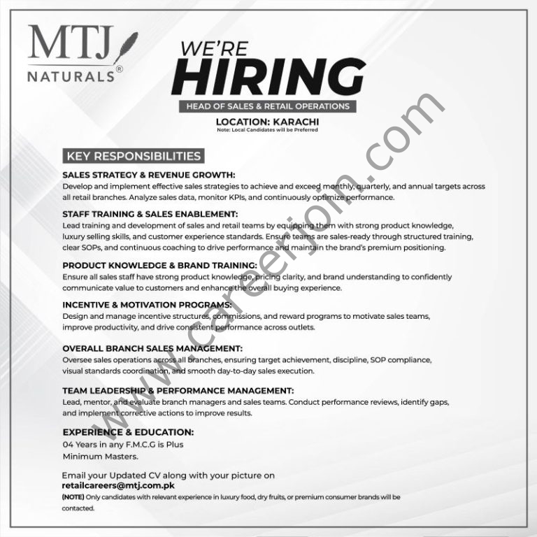 MTJ Naturals is looking for an experienced leader to drive sales growth and manage retail operations across outlets.